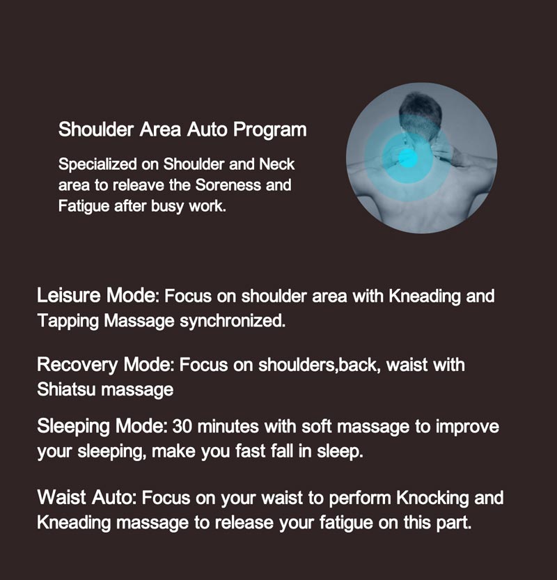 3.Smart mechanism hands to perform kneading,tapping, shiatsu, squeezing and rubbing massage that could improves the sensibility and comfort of the massage modes.